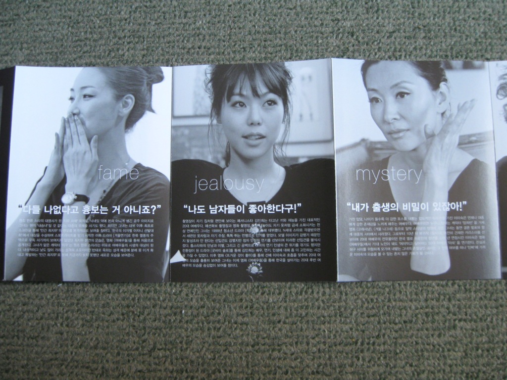 Innanzitutto voglio sottolineare che, se mi sono comprato il DVD di The Actresses, significa che il film mi è davvero piaciuto e le considerazioni scritte dopo la visione festivaliera al FEFF, non erano solo frutto della febbre. Detto questo l'edizione che porto alla vostra attenzione questa volta è una "first press limited edition" esattamente come quelle di Thirst di qualche tempo fa, una consuetudine per i film nuovi che escono sul mercato home video coreano. Regione 3 a parte (un limite fino ad un certo punto, intendiamoci) il DVD è fruibile a livello internazionale grazie ai sottotitoli in inglese affiancati a quelli in coreano, entrambi attivabili a piacimento per la traccia audio originale codificata in Dolby Digital 5.1 e 2.0 stereo. Il video, in formato anamorfico, è riprodotto nel corretto aspect ratio di 1.85:1. Snocciolati i parametri tecnici, a mio avviso fondamentali per valutare l' "acquistabilità" di un DVD, volevo concentrarmi in conclusione sulla confezione che, perfettamente in tema con il film, celebra in qualche modo le sei splendide protagoniste riproducendo le loro foto nella parte interna e in quella esterna del digipack pieghevole e nel flyer presente all' interno della confezione. Il DVD è acquistabile dal fornitissimo sito YesAsia a poco più di venti Euro.